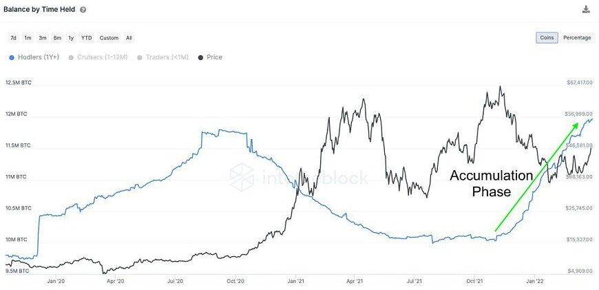 Долгосрочные криптовалютные инвесторы продолжают скупать биткоин. Об этом у себя на странице в твиттере сообщили аналитики ресурса IntoTheBlock. По словам экспертов, резервы инвесторов, которые хранят криптовалюту более года, приблизились к 12 млн BTC (~$550 млрд). Это исторический максимум.