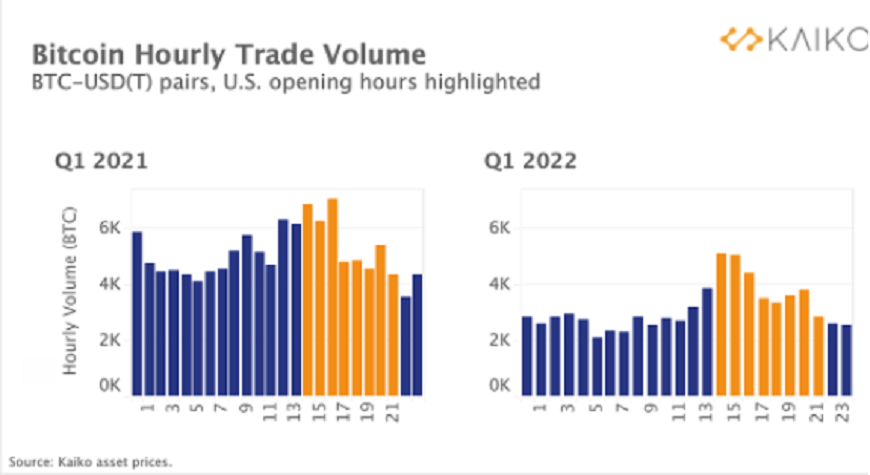 Эксперты отмечают, что текущие средние часовые объемы торгов примерно на 50% ниже по сравнению с 2021 годом. По мнению Kaiko, снижение связано с тем, что инвесторы потеряли интерес к риску. В то же время падение объемов торгов и одновременный рост активности на американской сессии подтверждает теорию о растущей корреляции между биткоином и фондовым рынком.