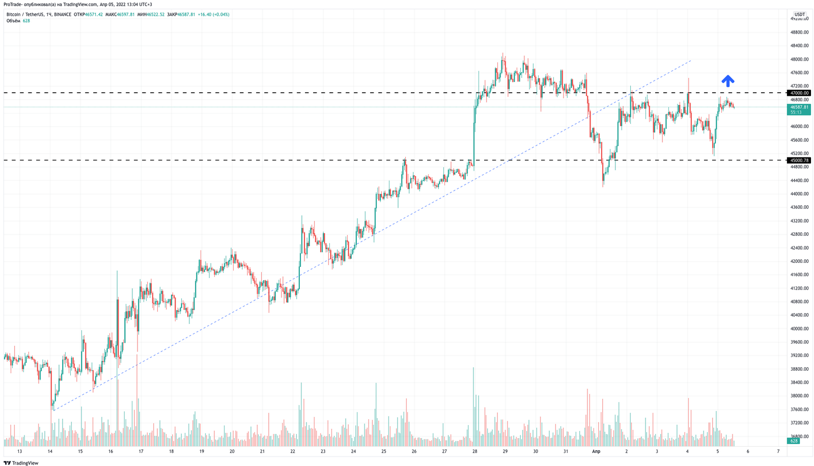 Точка излома по предложению находится в пределах $47 тыс., а это важная информация, которая позволяет найти значение цены для входа в длинную позицию. При условии выхода цены за обозначенную область следует открыть покупку.