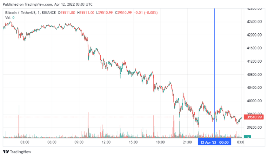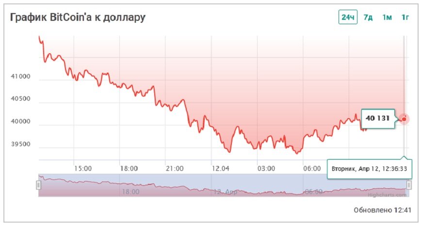 В ночь на 12 апреля курс биткоина падал до $39,2 тыс. По состоянию на 9:45 мск актив торгуется на уровне в $39,8 тыс., за прошедшие сутки он подешевел на 6%.