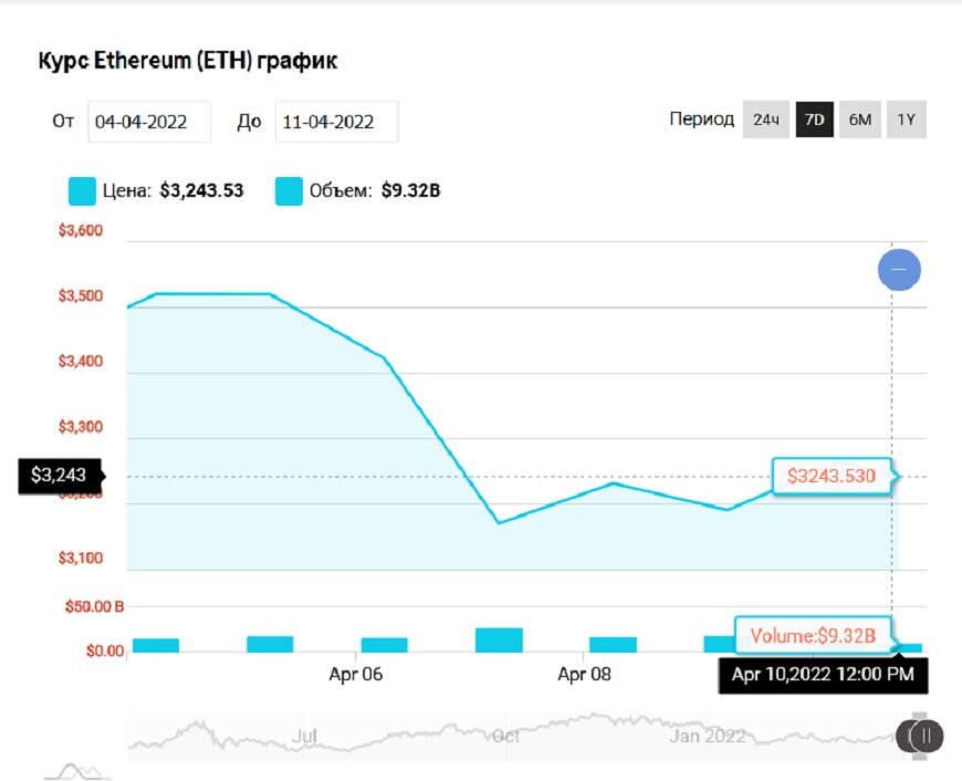 В понедельник, 11 апреля курс Ethereum на криптобирже Binance опустился до локального минимума в $3,06 тыс. За прошедшие сутки цена криптовалюты снизилась на 5%.