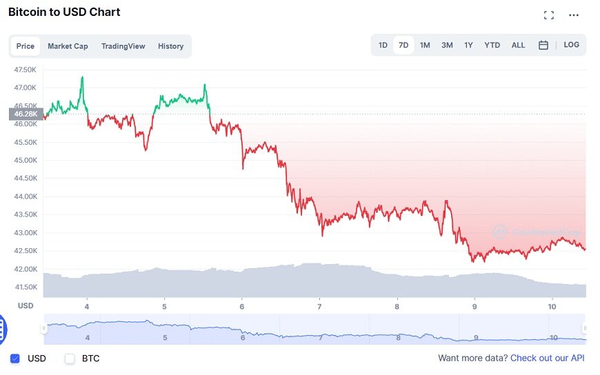 На момент написания днем в воскресенье ВТС торговался, по данным аналитического ресурса CoinMarketCap, в районе $42 525, c внутринедельным понижением на 8,1%.