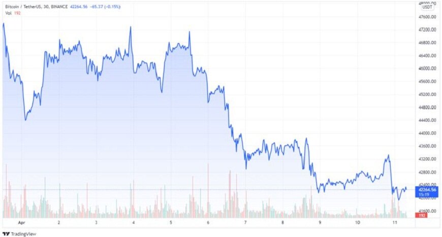 За прошедшую неделю цена биткоина снизилась на 7%. По состоянию на 10 апреля, 13:10 мск первая криптовалюта торгуется на уровне в $42,5 тыс. Эксперты «РБК-Крипто» рассказали, какой динамики ожидать от рынка в ближайшие 7 дней.