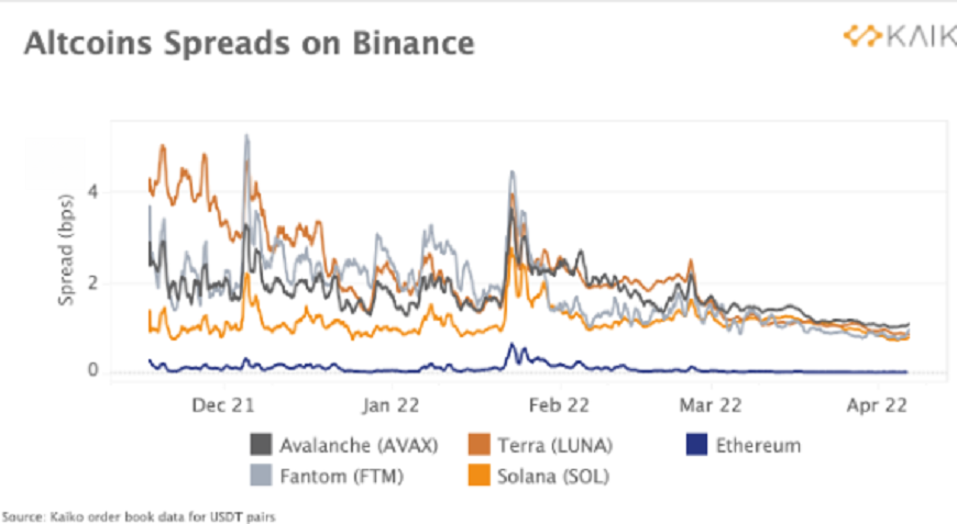 Тем не менее за последние несколько месяцев для активов в паре с USDT на Binance ситуация начала изменяться, утверждают аналитики. В частности, в Kaiko заметили, что с декабря 2021 года спреды для terra (LUNA) сократились вдвое, а для avalanche (AVAX) и fantom (FTM) — на базисный пункт. Спреды у solana (SOL) остались относительно неизменными.