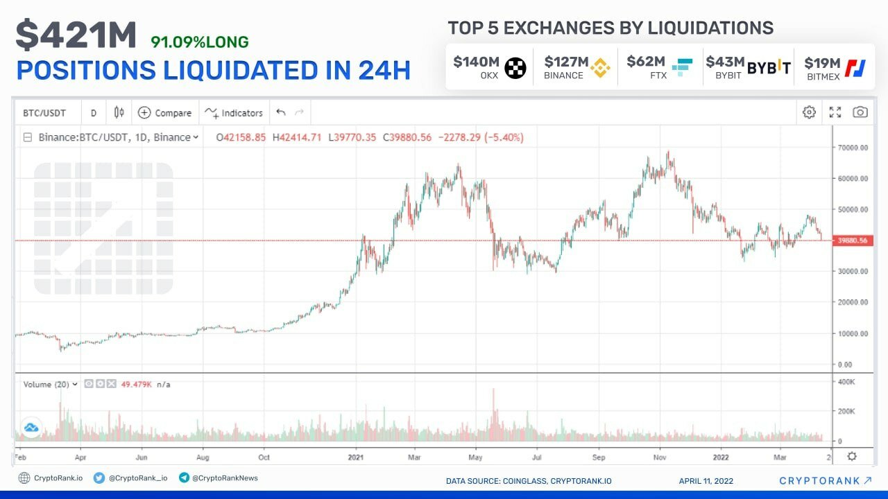 За сутки трейдеры потеряли более $421 млн на ликвидациях