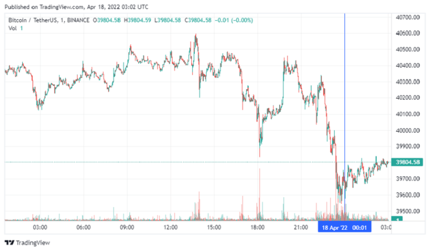 В ночь на 19 апреля курс биткоина на криптобирже Binance достигал $41,2 тыс. По состоянию на 9:45 мск первая криптовалюта торгуется на уровне в $40,7 тыс., за прошедшие сутки она подорожала на 5%. Цена актива растет после того, как утром 18 апреля она обновила месячный минимум на отметке в $38,5 тыс.
