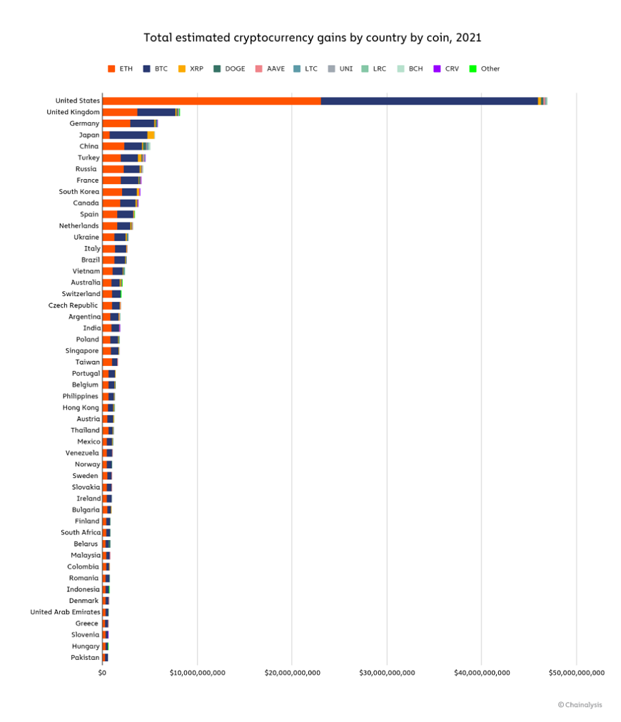Инвесторы в криптовалюту за 2021 год заработали $162,7 млрд, а наибольший прирост дохода зафиксирован в США, где инвесторы заработали почти $47 млрд.