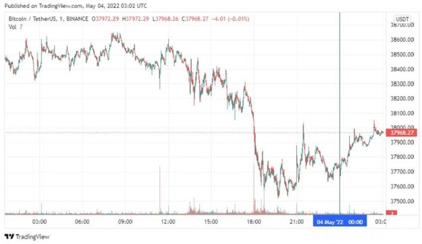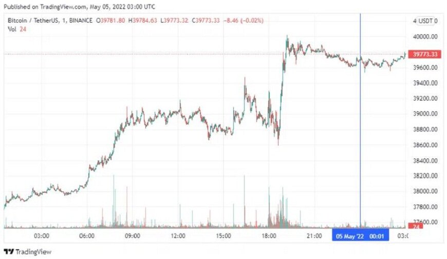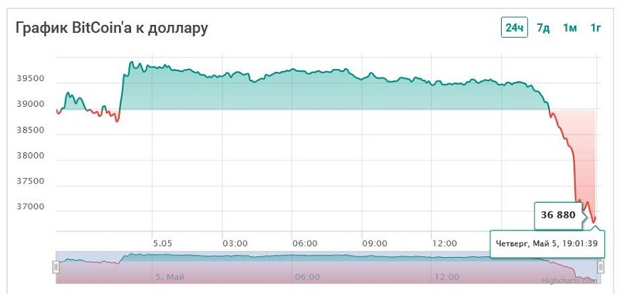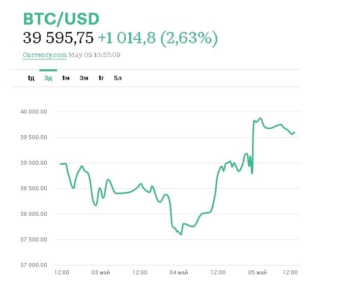 Стоимость первой криптовалюты вновь превысила $39 тыс., хотя вечером 3 мая она падала до $37,5 тыс.