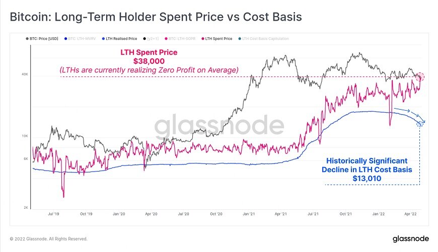 В то же время метрика продаж (рассчитывает среднюю цену покупки биткоина и обозначена на графике розовой линией) среди LTH выросла до $38 000. Корреляция метрики продаж со спотовой ценой биткоина на биржах сигнализирует о том, что долгосрочные инвесторы в основном выходят в ноль при таких панических продажах.