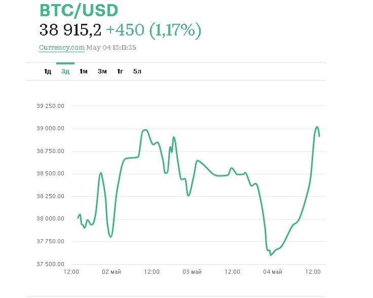 Днем 4 мая курс биткоина достиг $39,1 тыс. При этом вечером прошлого дня стоимость криптовалюты падала до $37,5 тыс. Таким образом, за 13 часов актив подорожал на $1,6 тыс. или на 4%. По состоянию на 12:50 мск биткоин торгуется на уровне в $38,8 тыс., за прошедшие сутки его цена увеличилась на 1%.