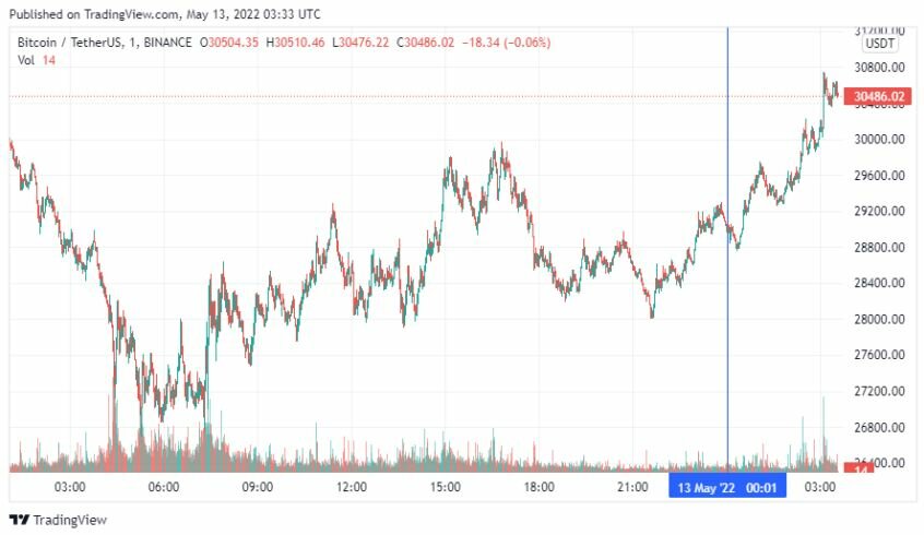 12 мая курс биткоина обновил минимум с декабря 2020 года на отметке в $26,7 тыс. По состоянию на 18:00 мск первая криптовалюта стоит $29,6 тыс., за прошедшие сутки она подешевела на 5%. Цена монеты продолжает падать после того, как в конце марта она превышала $48,1 тыс.