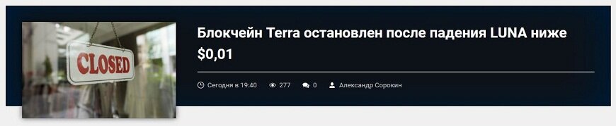 Ранее один из самых капитализированных алгоритмических стейблкоинов TerraUSD (UST) потерял привязку к доллару США. На этом фоне курс нативной криптовалюты проекта Terra (LUNA) в паре LUNA/USD упал более чем на 99% за неделю, а стейблкоин экосистемы, terraUSD (UST), до сих пор находится в свободном падении. На фоне волатильности разработчики проекта остановили работу блокчейна, чтобы избежать атаки на проект.
