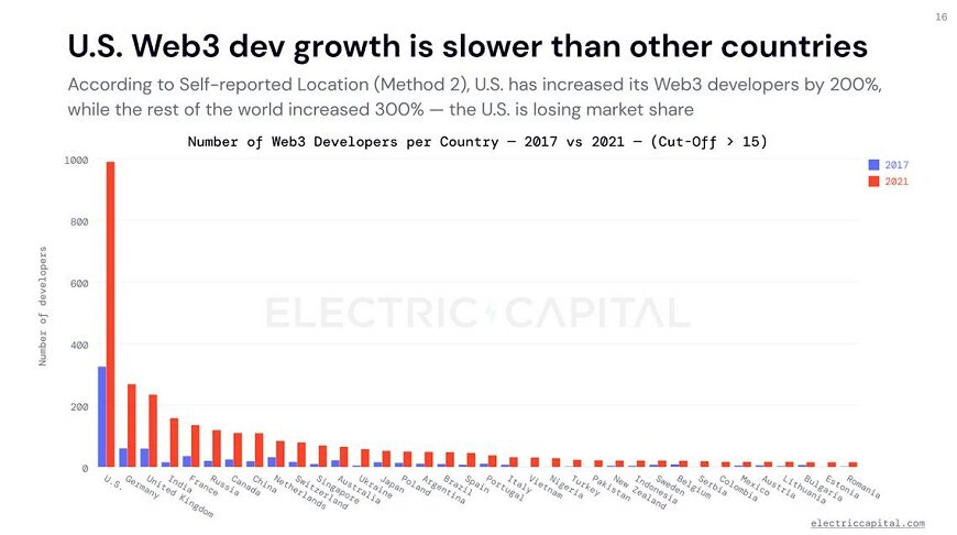 Согласно отчету Electric Capital, с 2017 года абсолютное число web3-разработчиков в США выросло на 200%. В остальном мире этот же показатель увеличился на 300%.