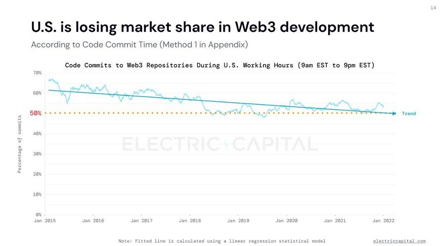 График, отображающий соотношение года и отправку кода в рабочее время в США, показал, что доля США в web3-разработке снизилась с 65% в 2012 году до 55% в 2022 году.