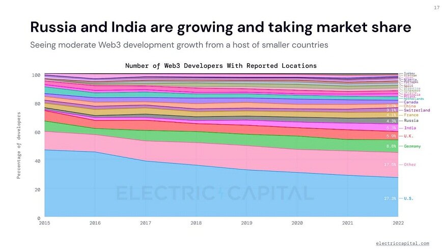 Согласно данным компании Electric Capital, США теряют долю рынка, связанную с web3-разработкой, а Россия и Индия вырываются вперед.
