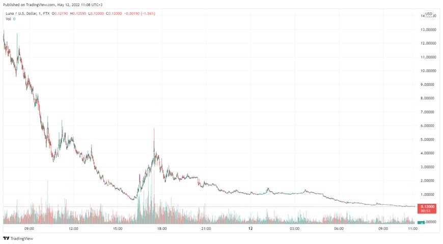 Токен LUNA продолжает свободное падение и сейчас уже находится на уровне $0,12. Вчера после снижения до $0,70 цену токена кратковременно подняли к $6-8 в зависимости от биржи.