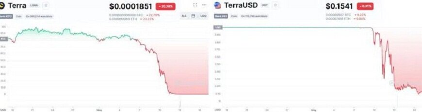 UST потерял привязку к доллару США 8 мая, когда произошел резкий отток активов из протокола Anchor, в результате снижения ставки доходности по депозитам до 17,87%. Пострадала и LUNA, которая используется для стабилизации цены UST. Эмиссию альткоина повысили до 6,9 трлн токенов.