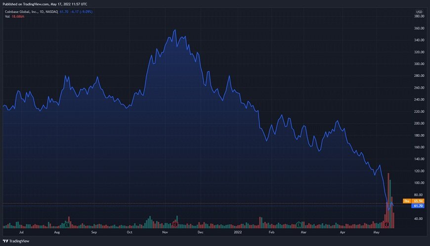 Тем временем котировки Coinbase (COIN) продолжают снижаться. На фоне новостей акции компании в торговой паре COIN/USD обновили исторический минимум, обвалившись на 9% до $61,7. С начала 2022 года акции криптовалютной биржи потеряли в цене более 75%. Рыночная капитализация компании сократилась до $13,7 млрд.