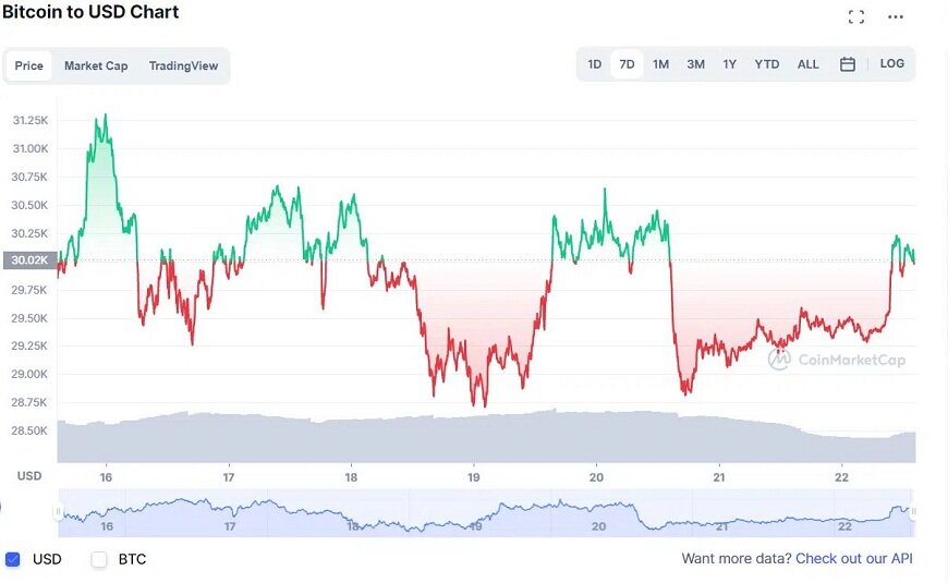 В целом всю неделю цена с переменным успехом пыталась отыграть поддержку в районе $30 000. На момент написания в воскресенье ВТС торговался, по данным аналитического ресурса CoinMarketCap, в районе $30 088, стараясь удержаться во внутринедельном флэте и то соскальзывая в красную зону, то восстанавливаясь в зеленую.