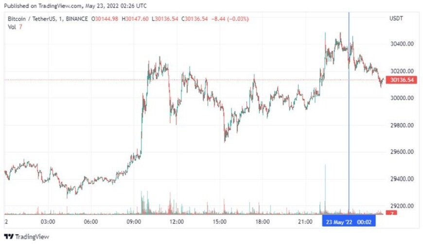 В понедельник, 23 мая курс биткоина достигал $30,6 тыс. По состоянию на 13:05 мск первая криптовалюта торгуется на уровне в $30,4 тыс., за прошедшие сутки она подорожала на 1%. За неделю стоимость актива снизилась на 3%.