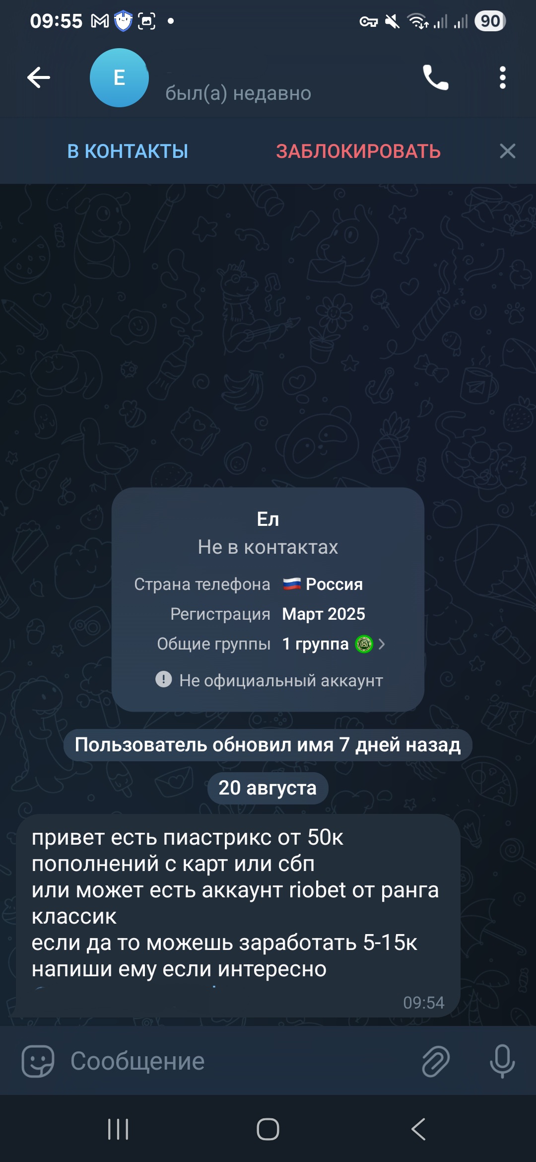 @ergotasya попалась я один раз на такого мошенника. Говорит, возьму в аренду пиастрикс, профит 50х50. Я особо им не пользовалась уже, перешла в основном на крипту, поэтому думаю почему бы и не сдать. В итоге он сделал один чек на 6500, себе 5000 вывел, мне оставил 1500. Я говорю договаривались же 50х50, он какую-то невнятную ерунду пробурчал, мол со следующего пополнения отдаст больше. В итоге пока он пробовал еще сделать, мне уже кошелек заблокировали. Лучше не связываться с этим
