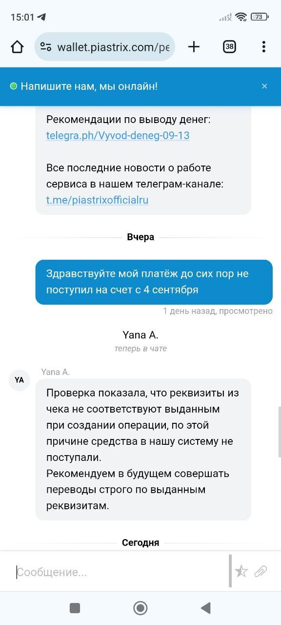 Сделал деп на пиастрикс и деньги не пришли , прошло уже почти двое суток, чек загрузил и им в поддержку (в которой кстате отвечает полубот и потом через 10ч опять такой же задает тежи вопросы и пропадает) загрузил чек на странице оплаты и загрузил в тг где типо платеж отслеживать, всеравно деньги не приходят, сумму банк и тд отправил без ошибочно, было у кого подобное? как долго деньги доходили и могут ли они вообще потеряться? у меня просто такого что 2 дня -не было .