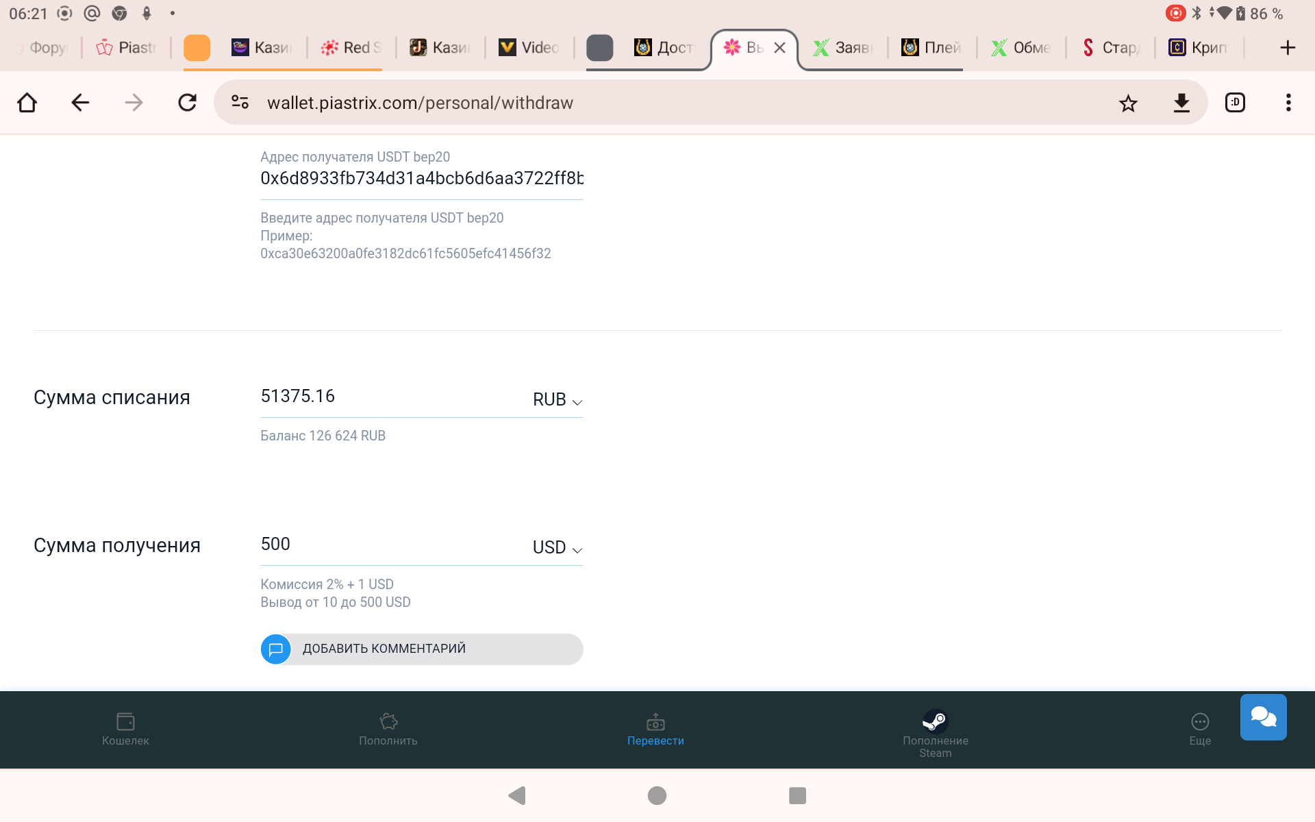 К слову парни🤓🤣!Решил для теста сейчас с пиастрикса вывести на крипту 500usdt и ок…ел с комсы,реально жестоко,10% и это при том что они пишут всего 2% плюс доллар Но это не так в корне!