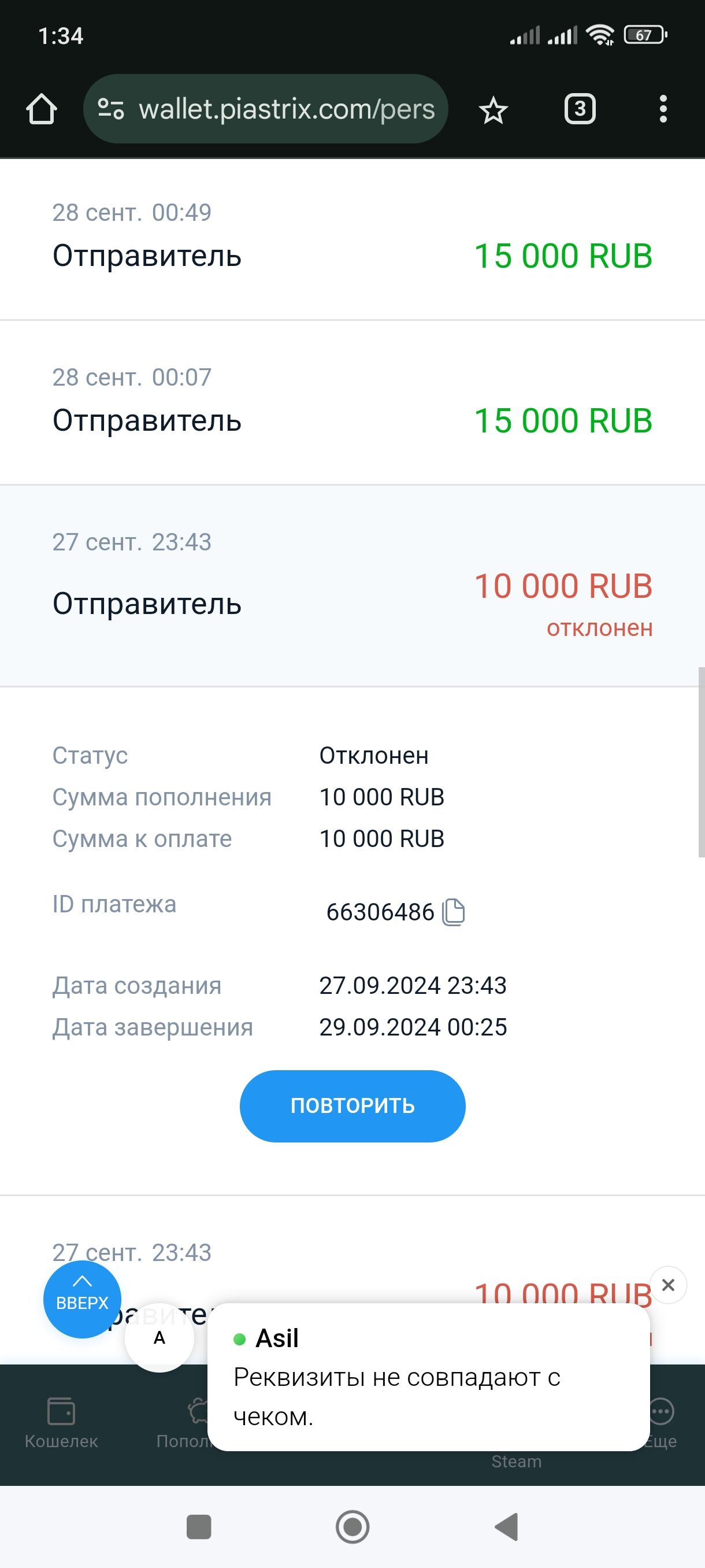 Давай будем считать подарено так деньги ушли и ими явно кто-то воспользовался и сегодня ещё десяточку приплюсуем к подаркам на пиастрикс. Я в шоке от их работы конечно все скинул говорят не совпадает как не совпадает я не понимаю.Ответ убил конечно и в итоге платеж отклонен куда бабки ушли хз .