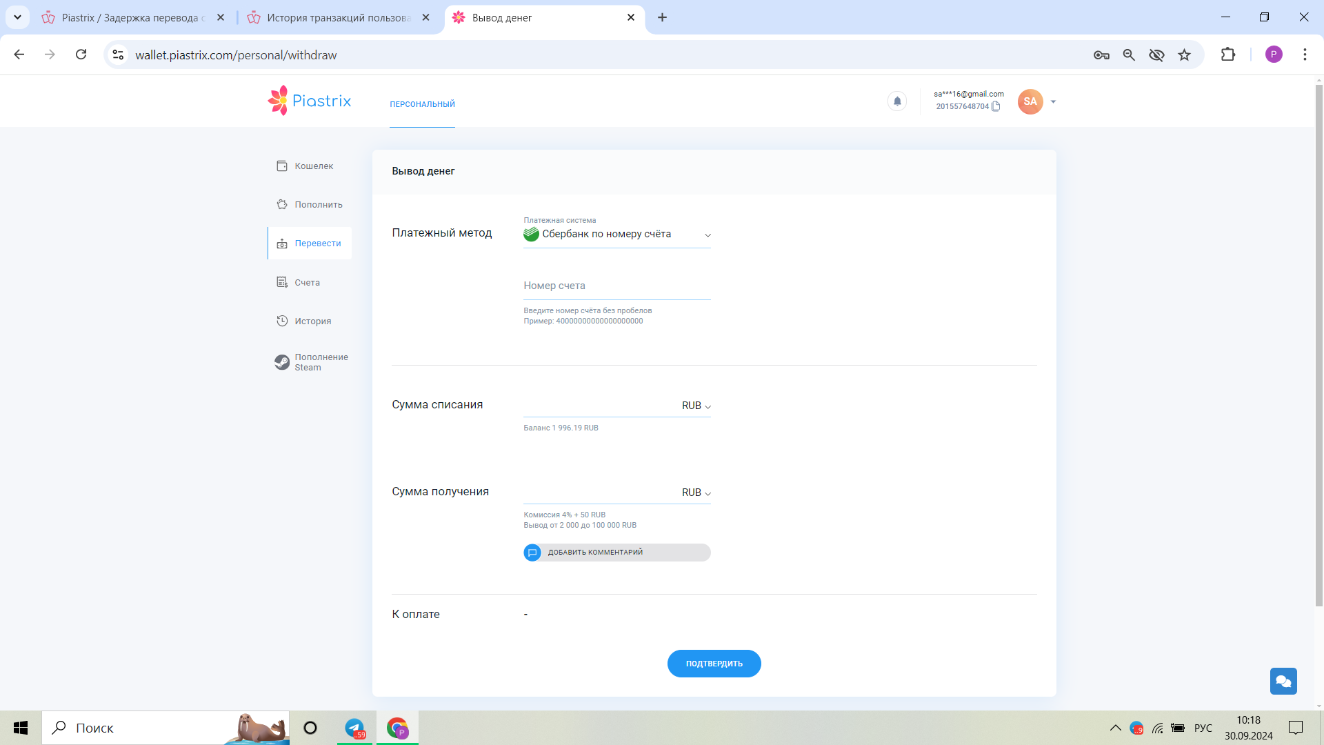 Piastrix / Задержка перевода средств на карту!