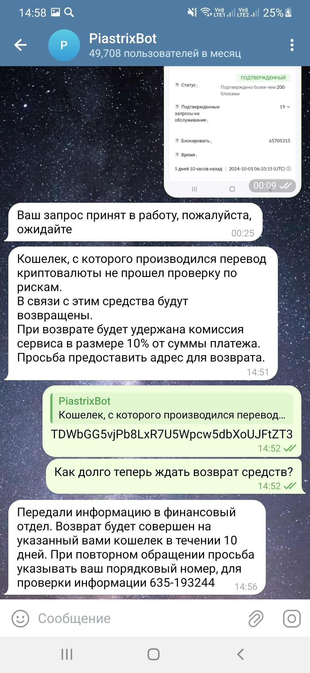 Бот который в тг — он тебе нечего не ответит, кроме чека+ID платежа поэтому он скорее расчитан на проблемы с картами а не криптой , пробуй достучатся до сп на сайте но сейчас у них там супер всё плохо, отвечают по 5 разых операторов и каждый новый пишет стандартную скрипту типо где чек и тд)