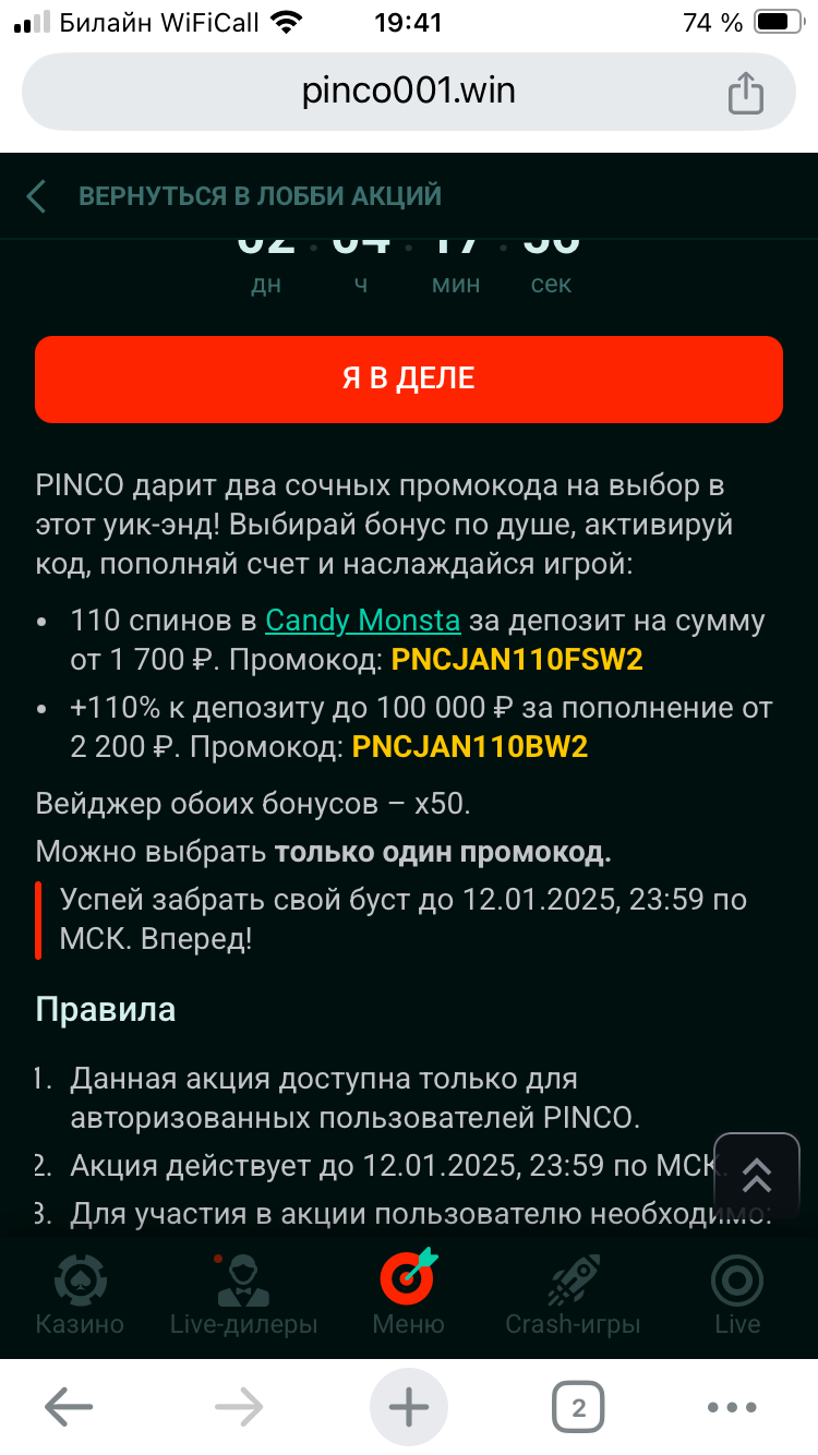 Пинко как всегда, классные бонусы, на выходные! Только подловили меня; снимал я у них с этих бонусов постоянно, 2000 поставил и 10-15 снял, пару раз так снял, разок проиграл, потом опять пару раз снял и т д…, Короче в нормальный плюс ушёл, по меркам среднего игрока! Конечно за период в несколько месяцев! Отбивался на семёрках всех типов(эндорфина). И вот всё вроде оставили как есть, только на бонусные нельзя пробивать стало, именно в мои любимые слоты, кроме одного, не буду перечислять. Да ещё и в некоторые игры которые отбивался, смотрю, не отбивается бонус!