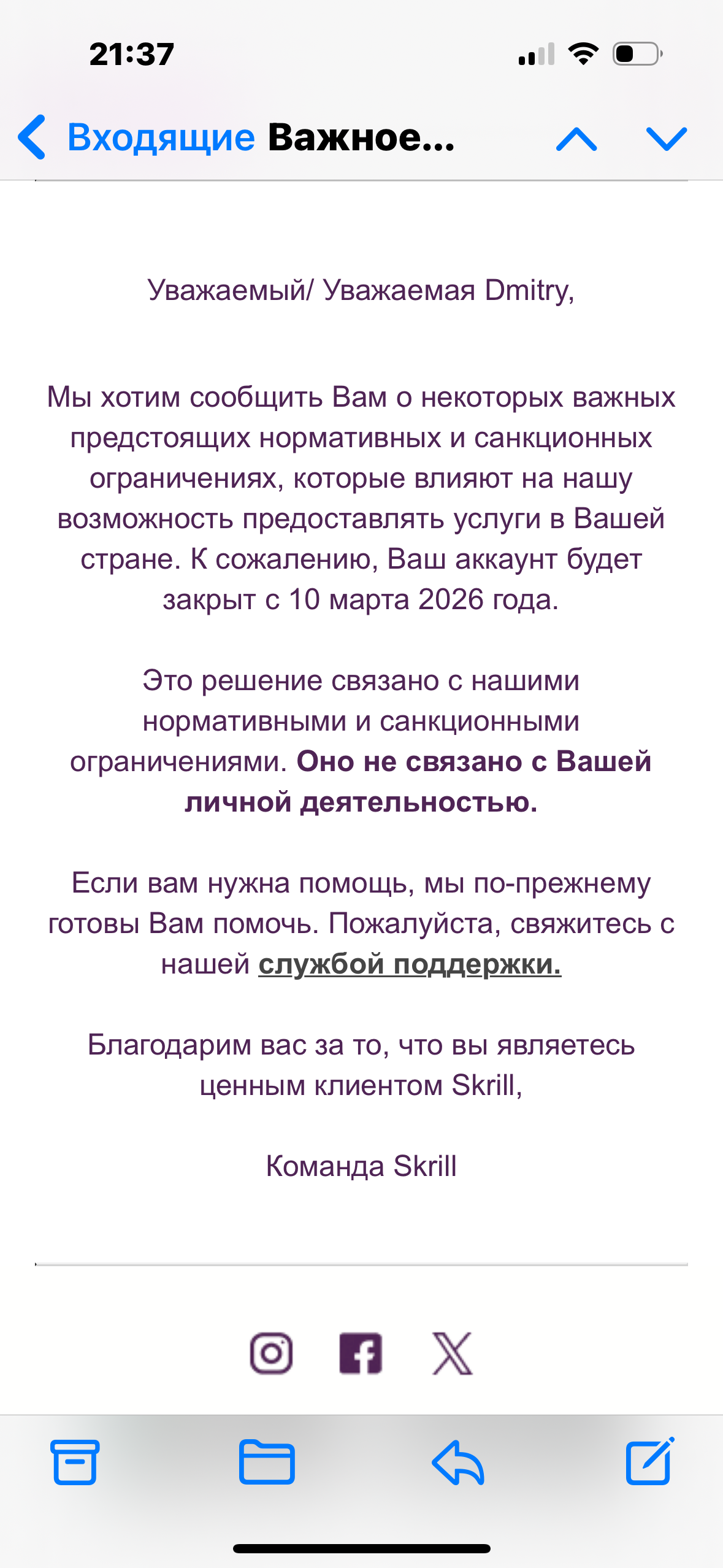 @godweles888 подтверждаю, что только вчера пришло. Да, они начали вещать еще с 22-го, но до сих пор работали кошельки исправно. Вчера хлопнули окончательно. Но в целом не велика потеря. Скрилл и Нетеллер уже скорее как рудименты, чем удобные кошельки. Комиссии конские, сложная регуляция. Ограничения на шаг влево, шаг вправо. Такое себе…