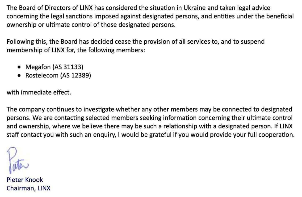 Несколько часов назад в LINX (London Internet Exchange) подтвердили отключение ключевых провайдеров РФ от точки международного обмена трафиком.