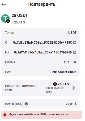 @goldking Смотри, у тебя там при отправке есть пункт с комсой, нажимаешь на него, оно пишет USDT bep20 комса 0.03543534$, потенциально из своего балика эти 4 цента убери и отправишь, т.е. у тебя 25$ на перевод, поставь на отправку 24.96$ и получится.