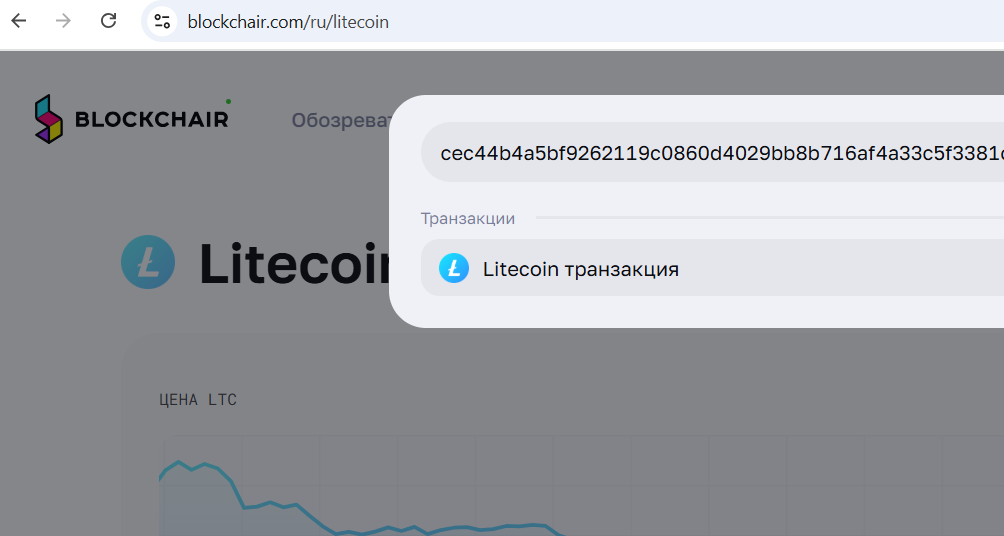 В поиске вставь хэш, там выдаст Litecoin транзакция, жми на неё и посмотришь