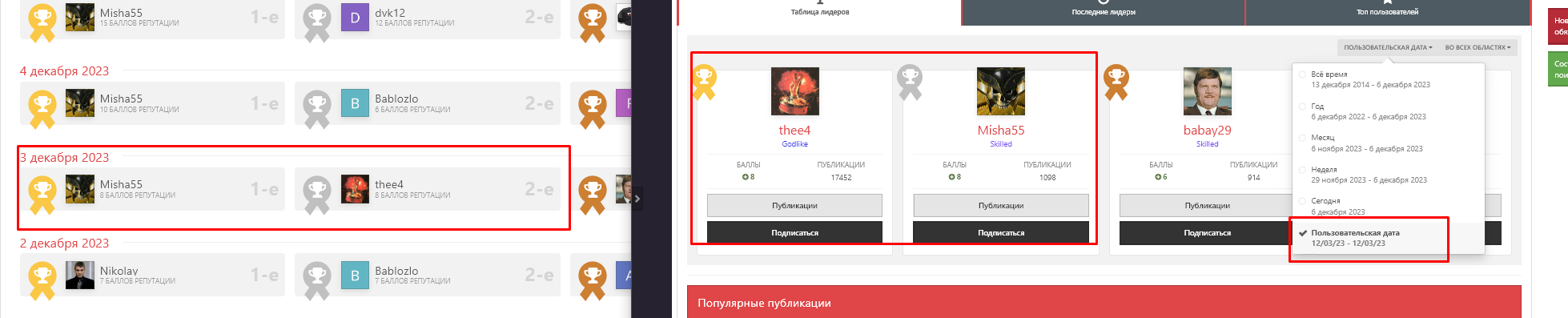 За 3 декабря у двоих форумчан одинаковое количество баллов и система рандомно определяет лидера 4 декабря одного из них! А уже 5 декабря опять таки рандомно, за тоже 3 декабря, но уже другого. Именно в этом была суть вопроса, как такое может быть? 😉