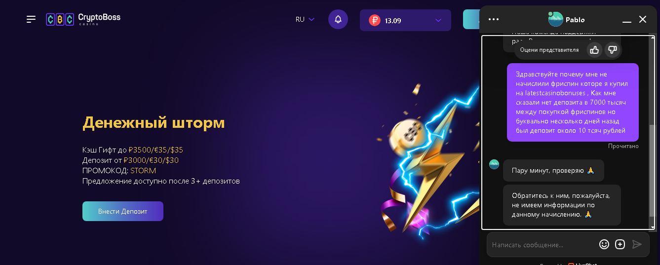 Я купил Бонус В казино Криптобос но мне вернули заказ с формулировкой—- Отказ. Нет нового депозита в казино——