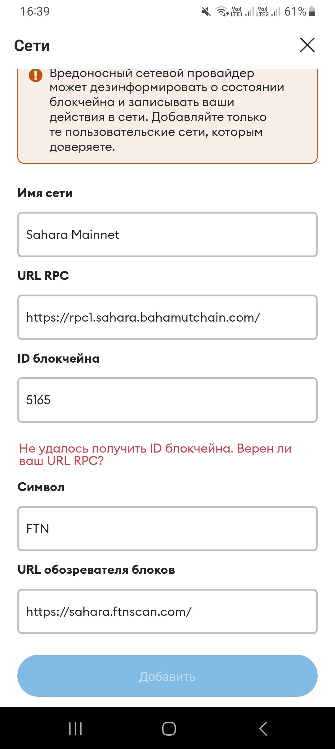 Народ кто в теме подскажите пожалуйста, что я не так делаю ? Суть в том, что на FTN пришло на метамаск с социалке призовые, но там они не отображались и ранее было такое удалял приложение metamask и после восстановления акка 12 фраз привязывал, открывал Sahara Mainnet после всё отображались средства спокойно пополнял тот же joinus сейчас никак не получается выходит ошибка не верный ID RPC url хотя всё те-же шаги выполняю и да перейдя по ссылке непосредственно Fasttoken FTNscan они там имеются, кто в теме плиз помогите, подскажите?