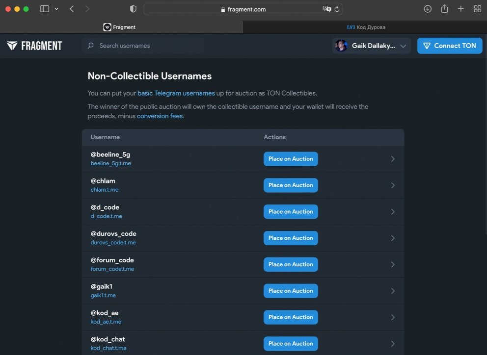 На данный момент самый дорогой ник на Fragment — casino. Его стоимость составляет 52,5 тыс. TON или ₽6,19 млн.