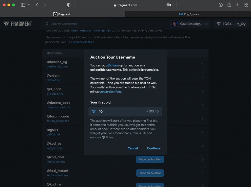 вернуться на сайт Fragment и в открывшемся окне «Auction Your Username» сделать первоначальную ставку — не менее 10 TON.