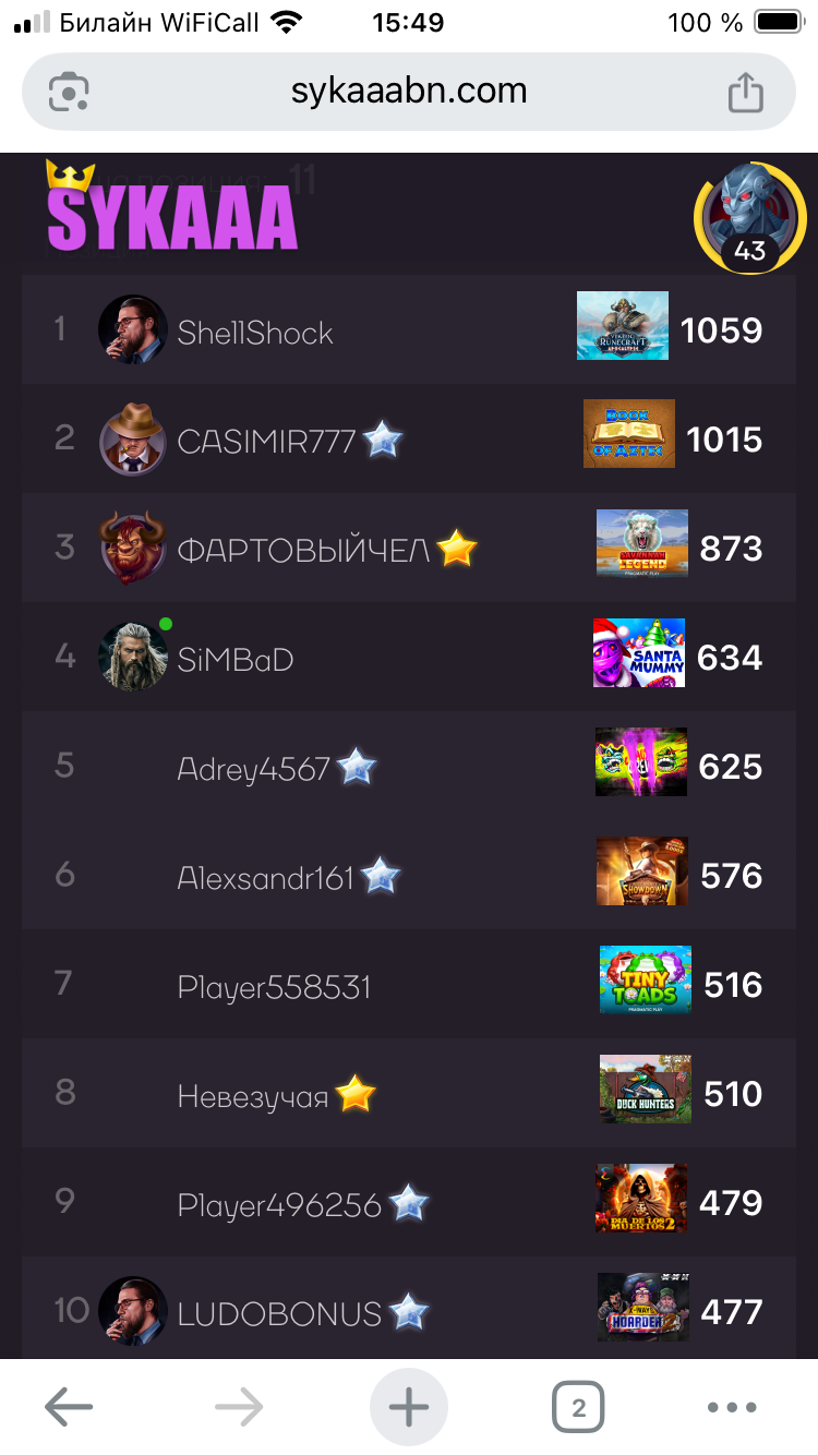 Турнир проходит уже 4 дня, даже поболее, ещё позавчера я был на 8 месте с 460 очками, сейчас я на 11 ом. Лидер с х1000 с копейками, да турнир по множителям от ставки в 20 руб! При этом постоянно в казино более 2000 человек в игре!
