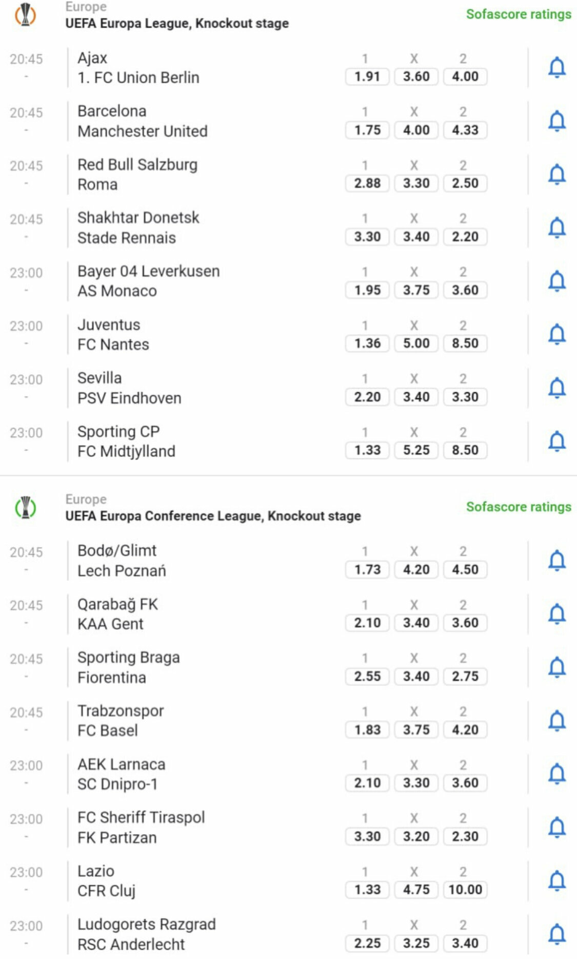 Пожалуй, это самая яркая вывеска 1/16 финала плей-офф Лиги Европы. Нас ждет интригующее противостояние “Барселоны” и “Манчестера Юнайтед”. Напомним, “сине-гранатовые” попали в ЛЕ вылетев из Лиги чемпионов, а вот “Манчестер Юнайтед” заслужил право играть в плей-офф в групповой стадии Лиги Европы, заняв итоговое второе место в таблице. Первый матч состоится на “Камп Ноу”. Хави или тен Хаг?