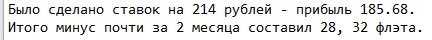Можно вопрос: вот ты пишешь что плюсуешь. Я следил за темой с января. Если ставить флэтом по 1 единице твои ставки, то статистика у тебя такая при среднем кэффе почти 1.7: