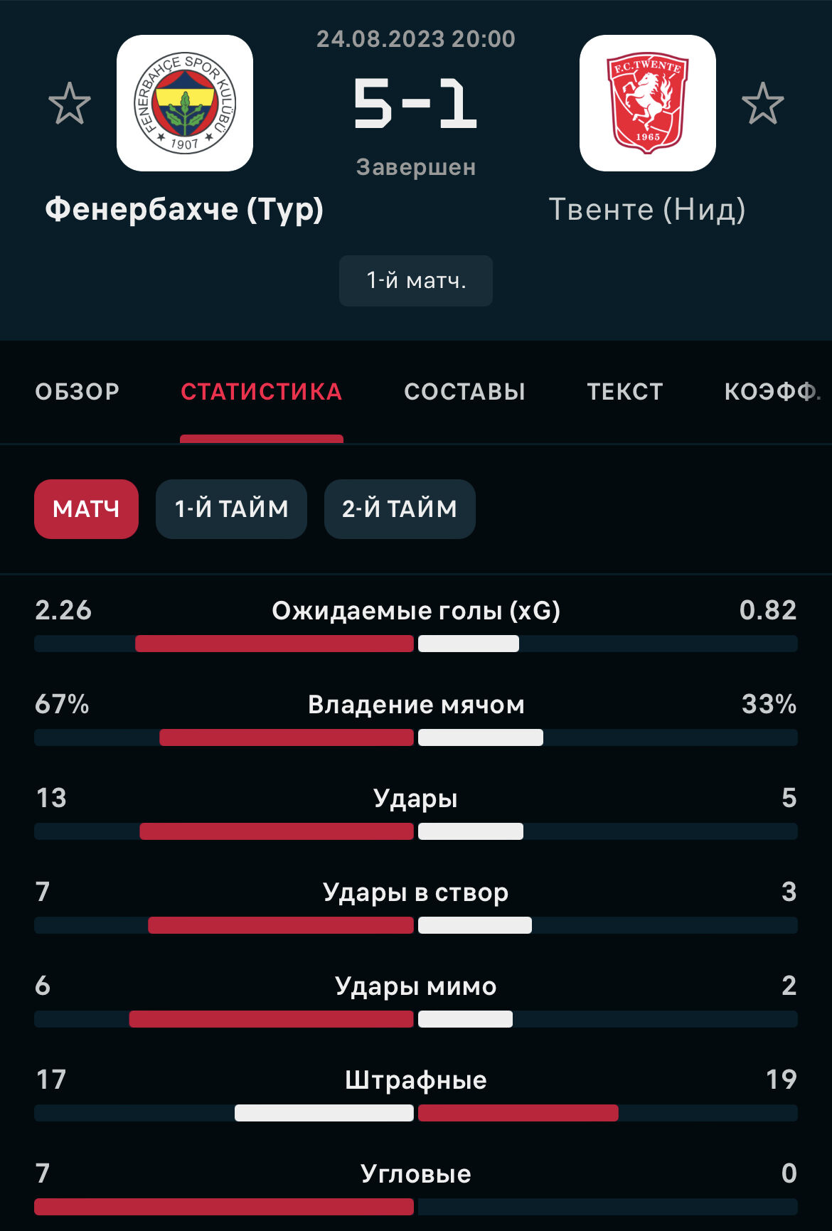 интересный выдался матч на голы , фенербахче после пропущенного гола от твенте разозлился и занес в сетку ворот гостей аж 5 голов , но по угловым тотал не пробили .
