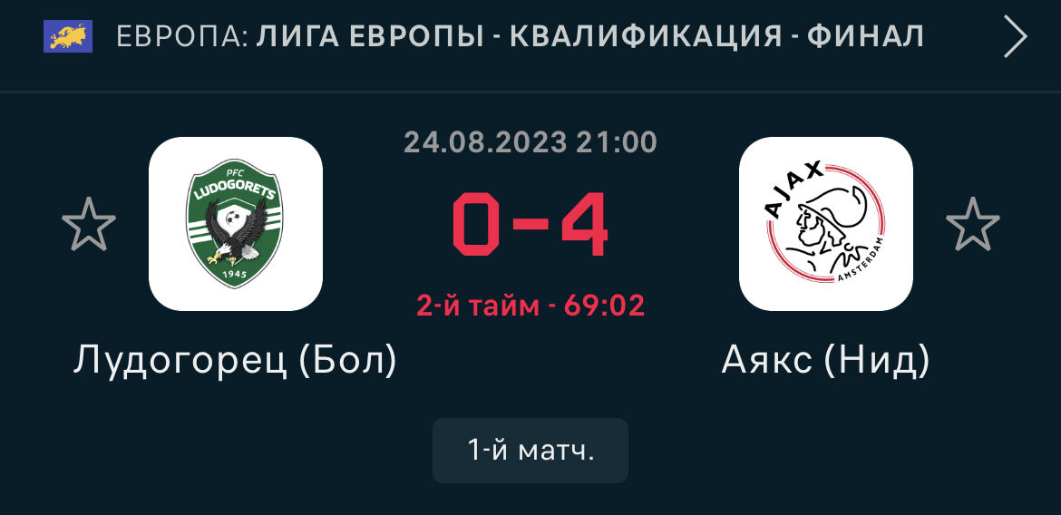 Средний тотал матчей сезона 2023/24 с участием “Лудогорца” — 3,45. В 8 из 11 игр хозяева поля пробивали “верховой” порогтотала”. “Аякс” провел пока только две игры, но в обоих случаях забивалось не менее четырех мячей — 4:1, 2:2. Встречаются две яркие команды, способные устроить фейерверк на поле.