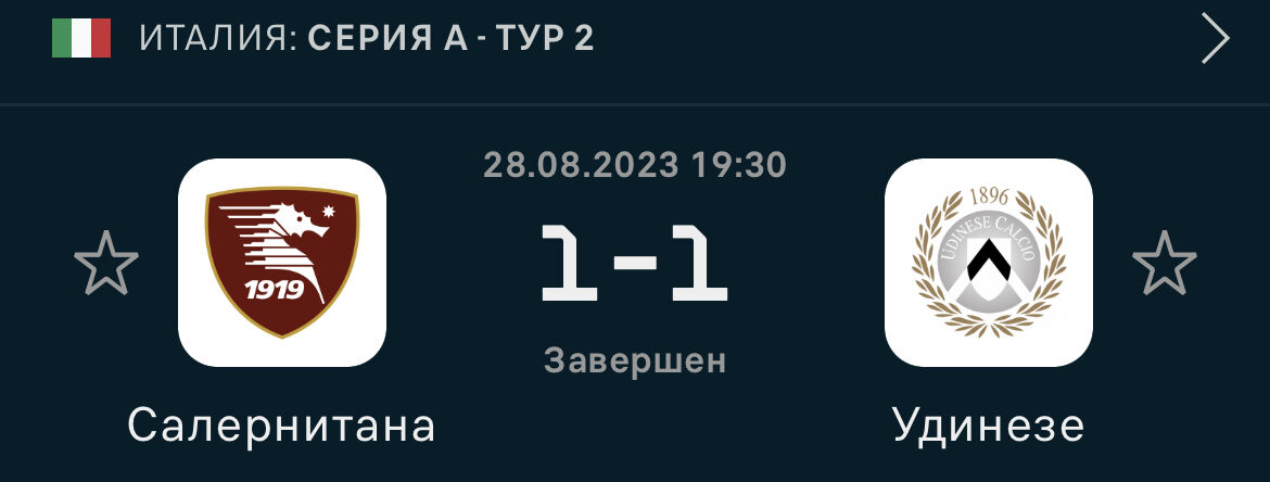 Хоть и первый гол забили именно Удинезе, но игра шла по сценарию хозяев и смогли отыграться во второй половине селернитанцы по итогу 1:1
