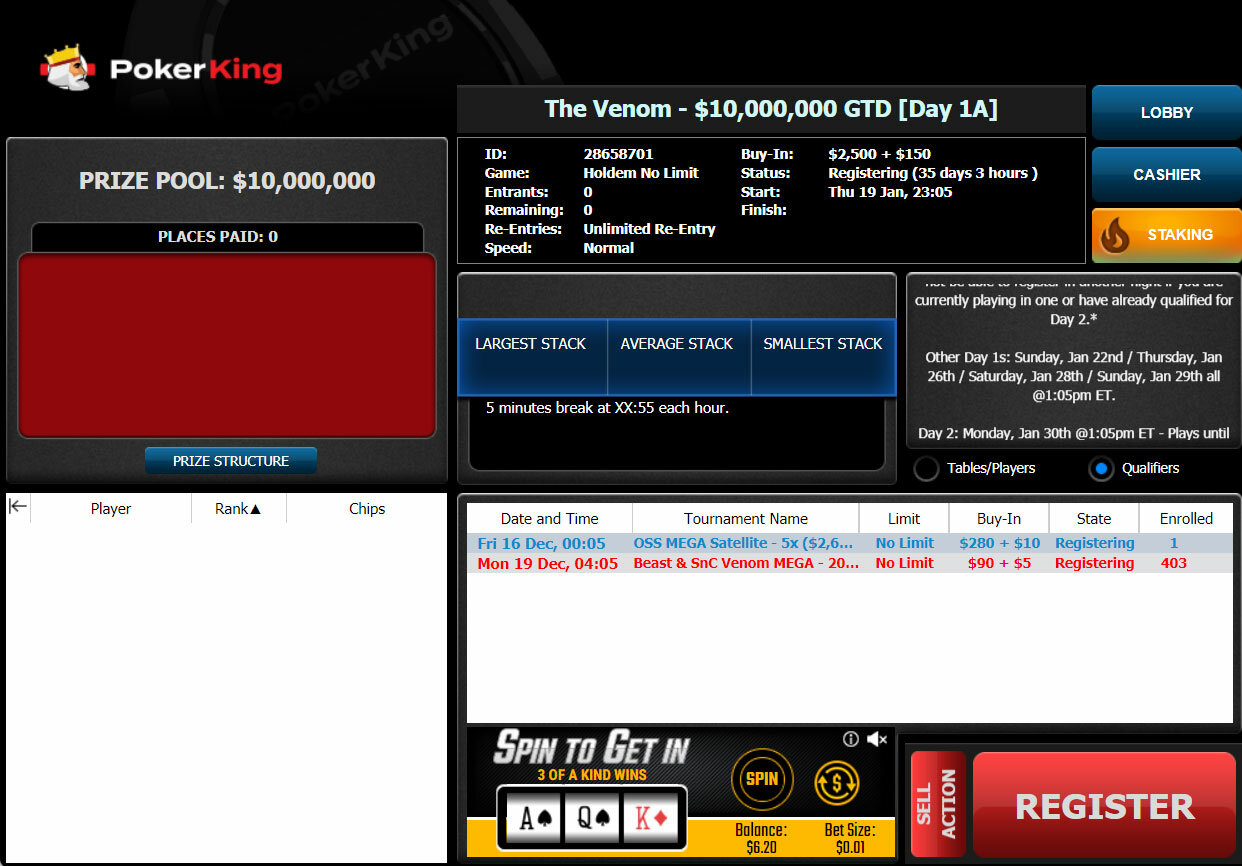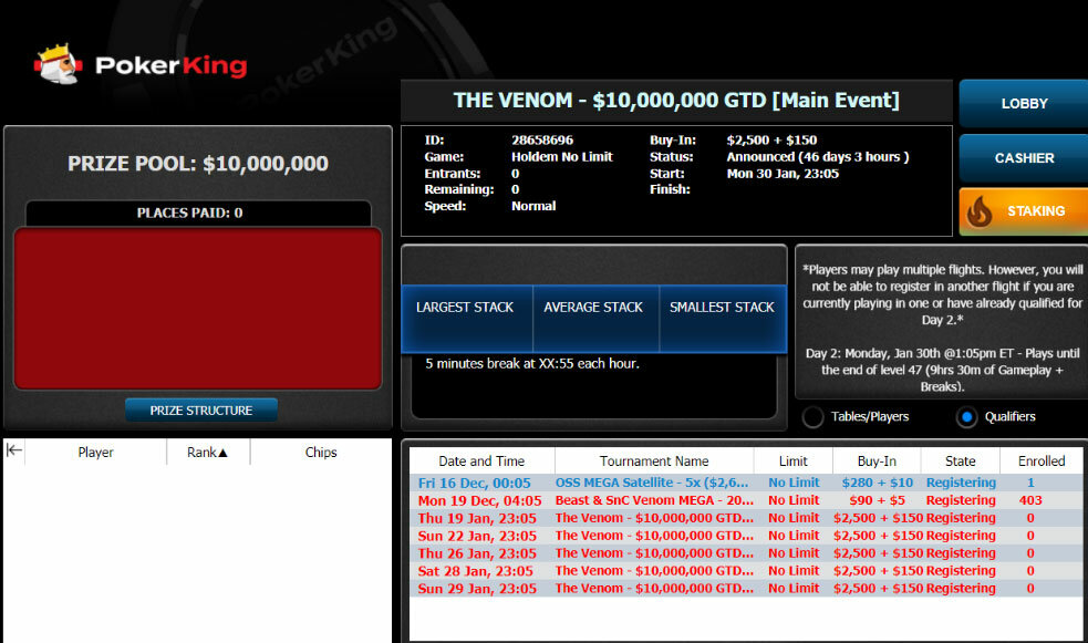 Стоимость сателлитов на турнир начинаются от $0. Эти бесплатные сателлиты называются “Venom Fever” и позволяют 750 игрокам попробовать свои силы в крупнейшем турнире PokerKing без внесения средств.