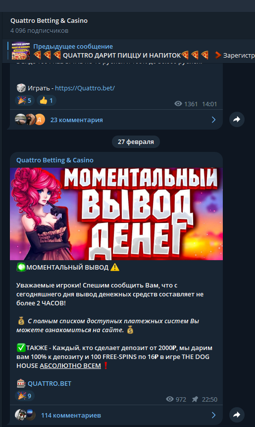 Текущие бонусы, акции, промокоды от Кватро Казино