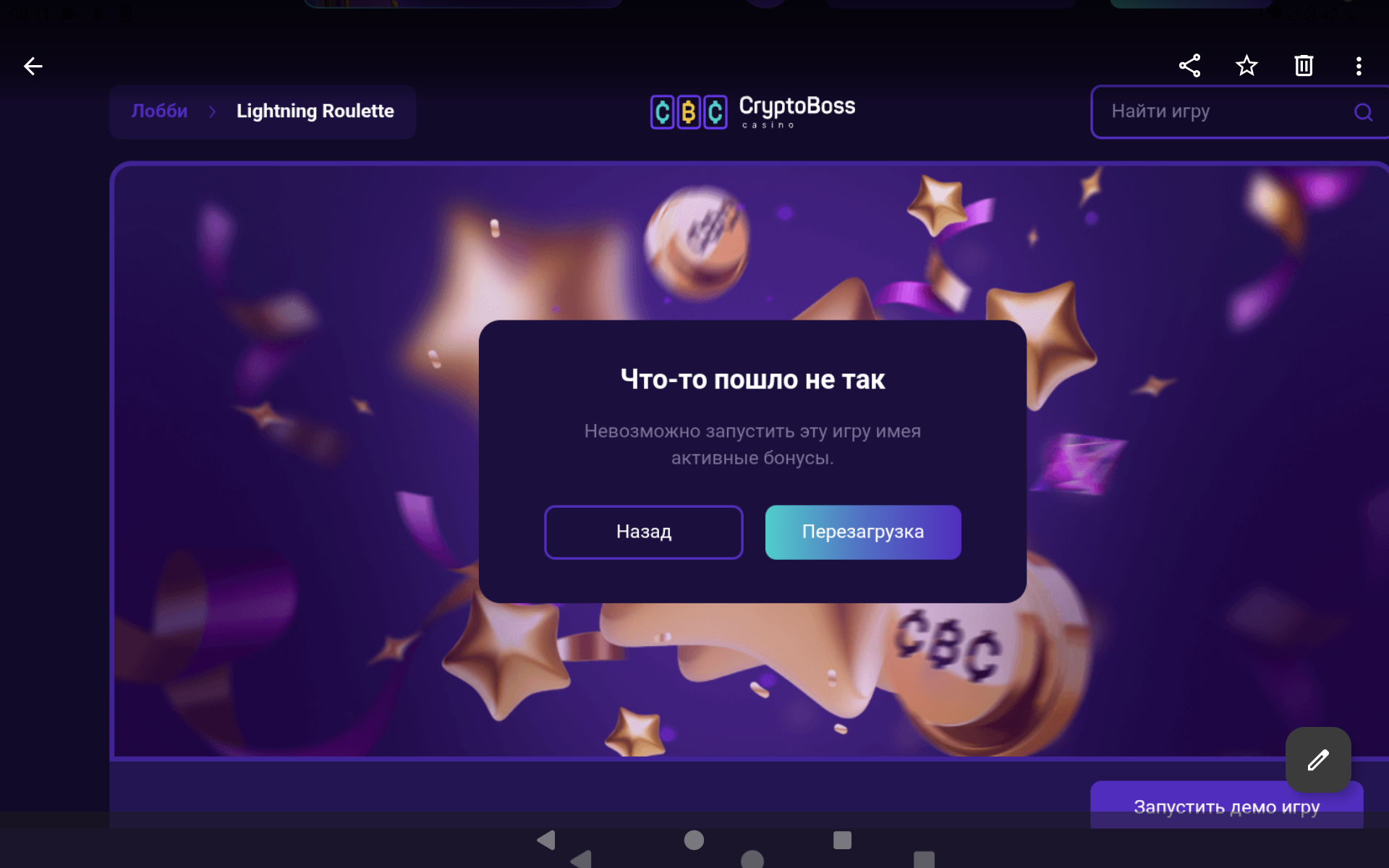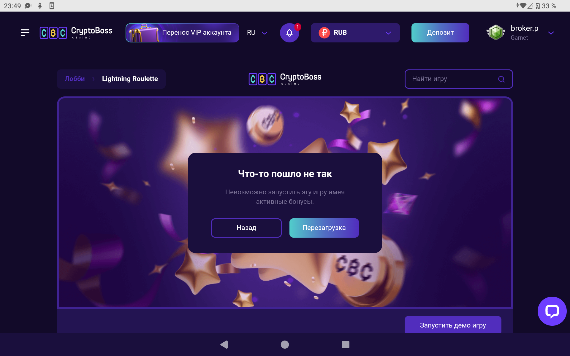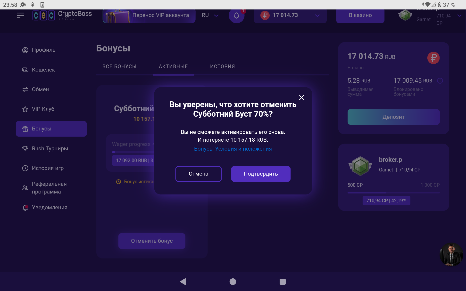 все было понятно сразу,перешёл в Лайв а он 🤣🤣🤣🤣🤣ограничен для Игры при наличии данных бонусов!!!!!!!Бонусы данные не Рекомендую от себя вносить ни в Криптобосс ,ни в их сетку!Мало того,что вводят в заблуждение и не прописывают все условия,так ещё и на отыгрыш даётся всего Один День!!!Также,игроки!Во все исключительно так называемые лайв игры с данными бонусами играть Запрещено ,про Макс вывод ограничение в 100 к мы уже знаем,но главное!!!!Отдачи Нет!!!Даже с бонусными Каз не играет и без доступа к лайв играм в Вас вообще нет ни единого Шанса.все как всегда,,тупой Жор и слив в Ноль Вашего баланса!!!!!