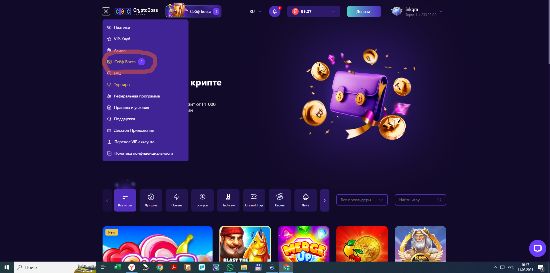 В Криптобоссе появился сундук с призами))). Давно не играл. Открыл — там было 100% к депозиту с вагером х45 и макс кешаутом 100к. Депнул вчера под бонус 5к,по маленьким ставкам покрутил Прагматик, хаксов, Бгейминг. Играло неплохо, удалось открутить вагер и сделать х5 от депозита. Депозит вносил через банковскую карту, на вывод поставил на крипту, вывели за 5 минут, при выводе из-за разницы курсов потерял с 25000 рублей 300.